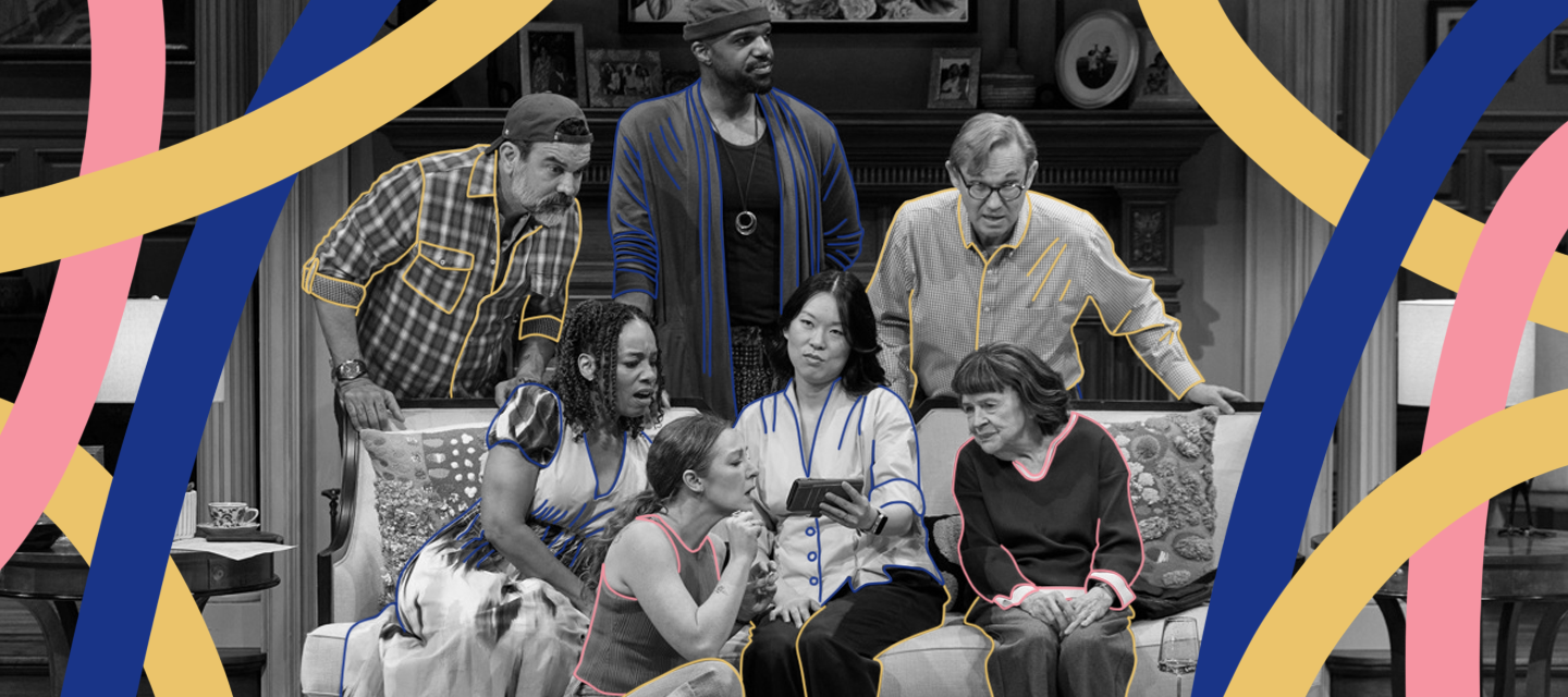 Speaking of aesthetic curation, we must discuss Derek McLane’s Architectural Digest–ready set. From the floor-to-ceiling drapes to the turquoise tiled fireplace to the burnt-orange and olive walls through the parlor doorways, every detail is stunning, right down to the artwork and the throw pillows (two of which I have already tracked down and purchased). Top-notch comedy and covetable home decor—all in a tidy 100-minute package.